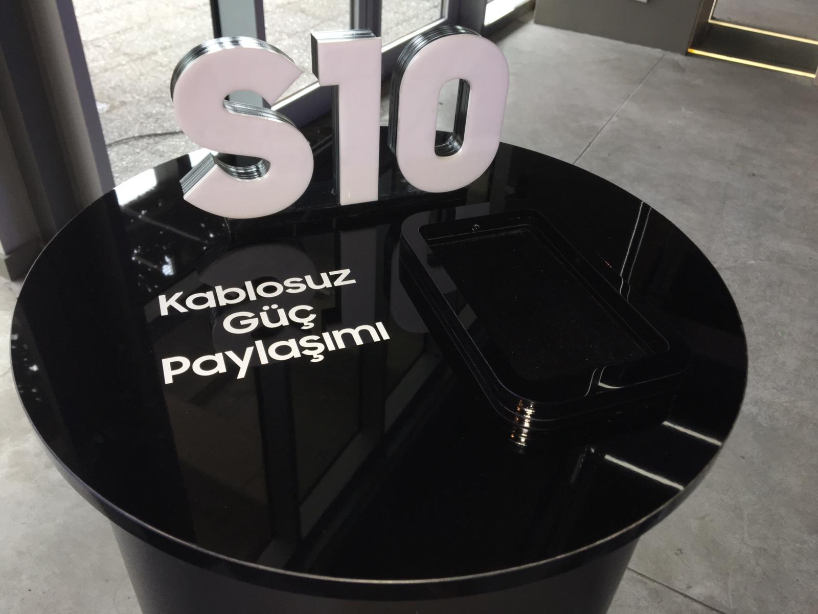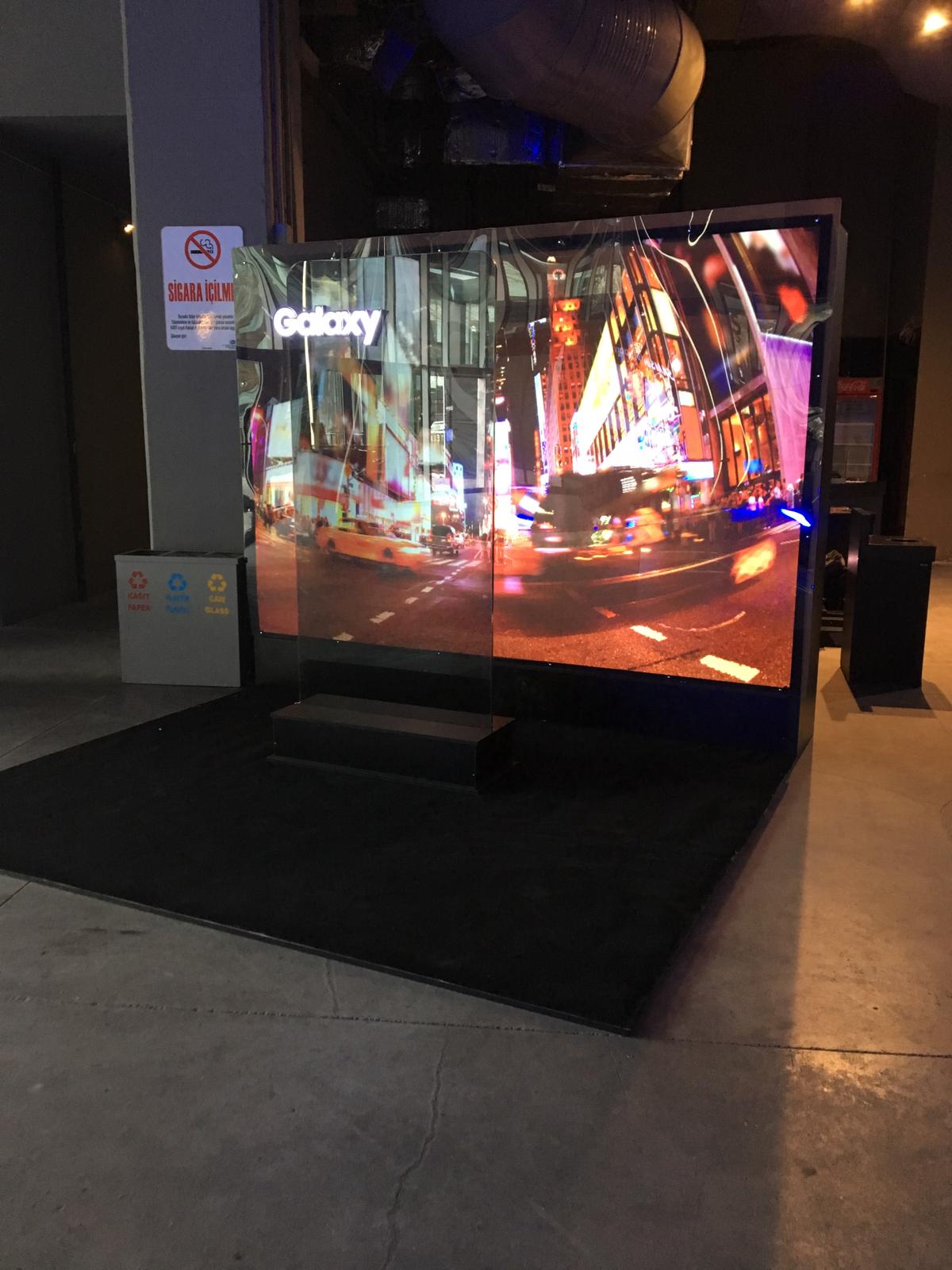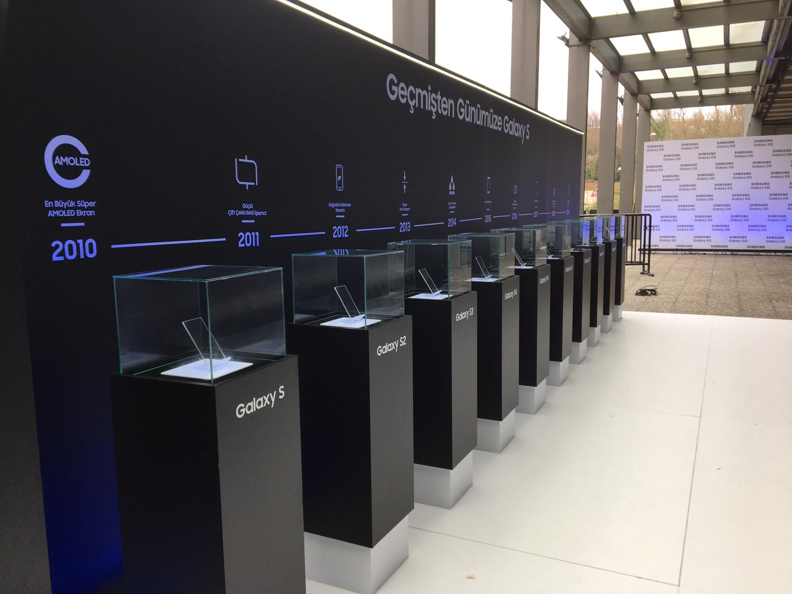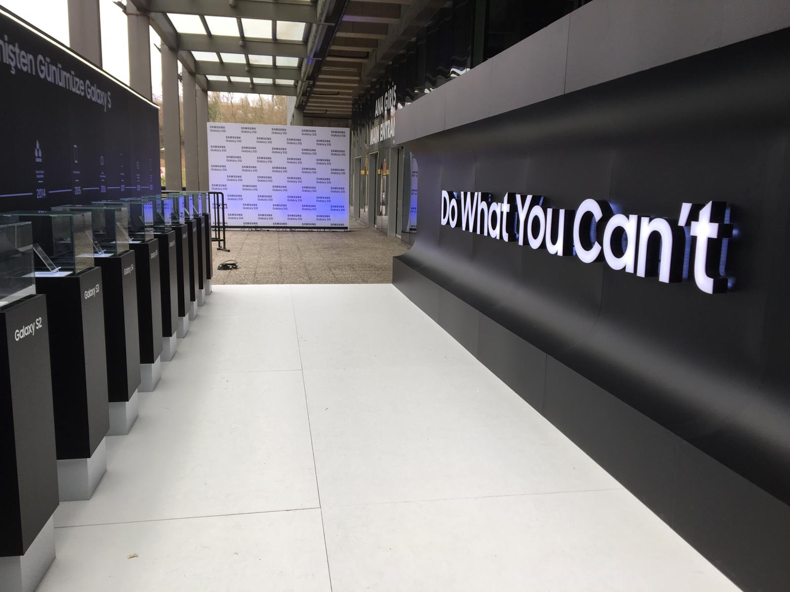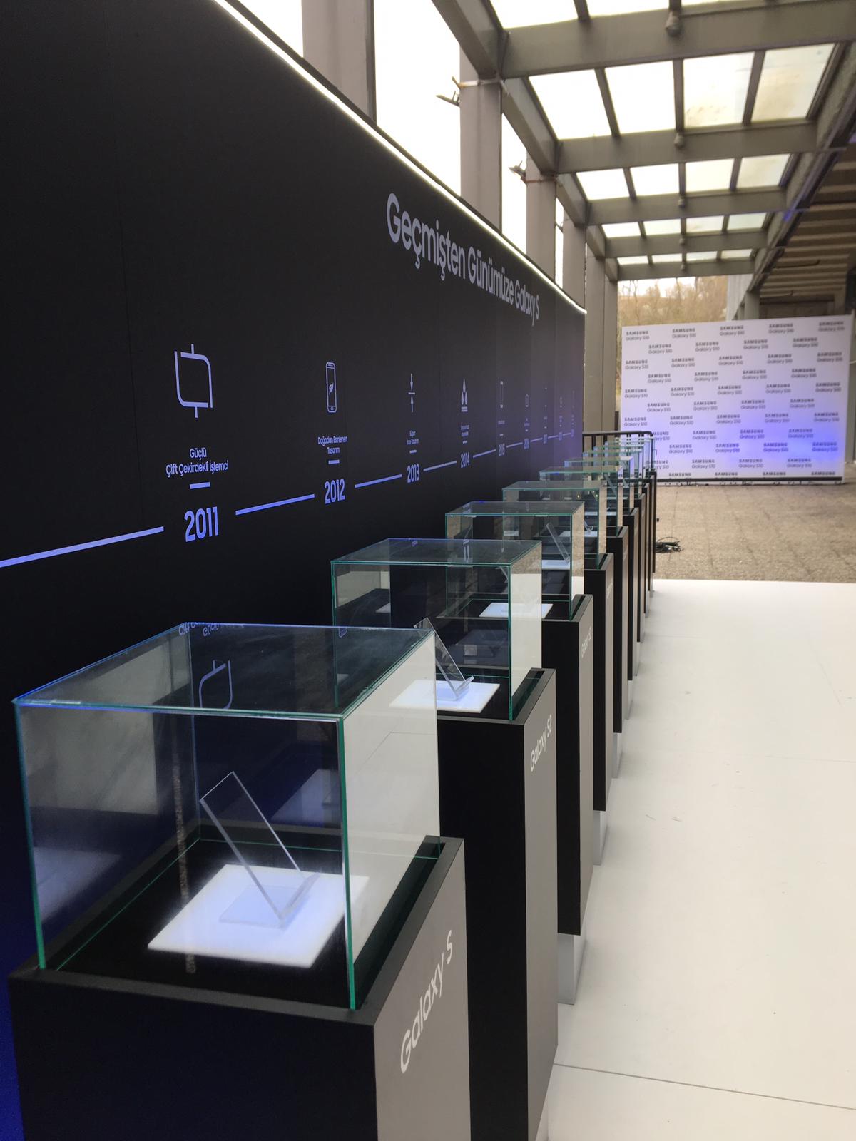 Stand / kiosk design work for Samsung, where we design, manufacture and assemble. The design was completely planned according to Samsung’s new model Galaxy S10 concept. The entire kiosk has been designed so that the S10 is visible when viewed from the side. The number 0 here was split in half and a corridor was created inside. In this corridor, a small presentation stand was produced for each model that the Galaxy series produced until the S10 model. On the rear backdrop, the innovation / feature that each model brought in its own period was explained. Moreover, it was designed in English on one wall of the corridor and in Turkish on the other wall.